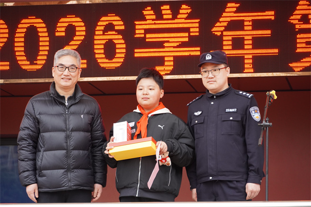 本次典礼中一段特别的环节温暖全场。六合区公安局龙池街道派出所副所长王亚伟现场宣读了我校学生在新年期间拾金不昧的感谢信。随后,校党总支书记、校长周德岳和王亚伟一起为该同学颁发奖品。这份“马年第一份温暖”,诠释了新时代少年的高尚美德。