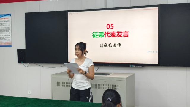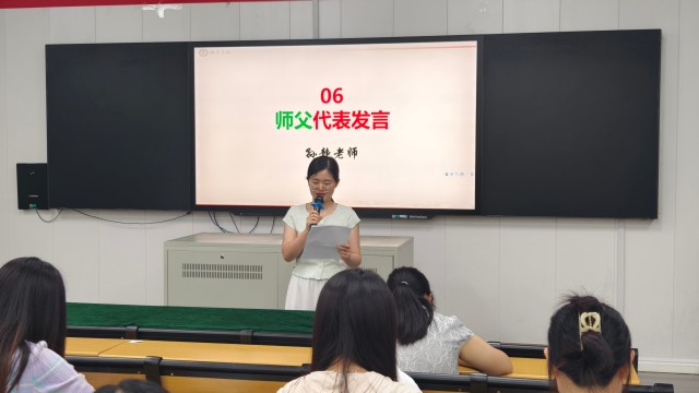 徒弟代表刘晓艺老师表态,将珍惜机遇,虚心求教,从教学基本功、教育情怀、人格魅力等突破自我;师父代表孙静老师承诺,毫无保留传授经验,通过“四带”助力徒弟三年内站稳讲台。