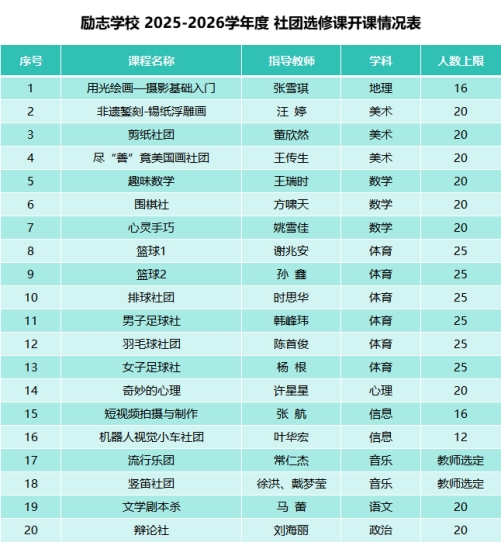 期待已久的选修课社团纳新终于来啦!本学期学校开设20门精彩纷呈的社团课程,既有传统经典项目,又有紧跟时代的创新课程,快来看看吧!