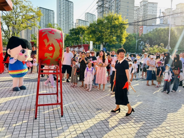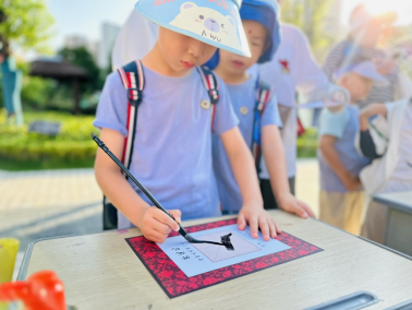 从校长施幼红击鼓宣布入场开始,一系列富有寓意的环节依次展开。吉祥物“美美”、“乐乐”在校门口热情迎接,教师们为新生整理衣冠、贴上美乐贴纸,践行“正衣冠,明事理”的初心;新生们敲击“鸣志鼓”立下求学志向,跨越“七个美”主题踏板象征成长进阶,在教师示范下用毛笔书写“人”字开启文化启蒙,接受朱砂点额后走过“启智门”,还抚摸寓意平安、吉祥的吉祥物,每一步都充满对未来的美好期许。