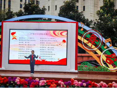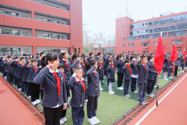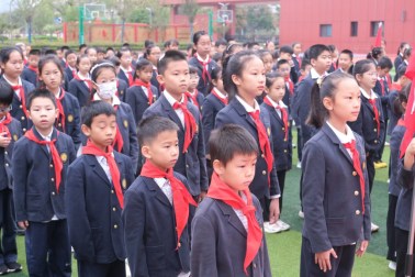 伴随着激昂的出旗曲,旗手们迈着坚定有力的步伐护送队旗入场,随后,全场齐唱《中国少年先锋队队歌》,嘹亮的歌声唱出了新时代少年的昂扬风貌。