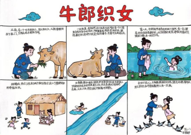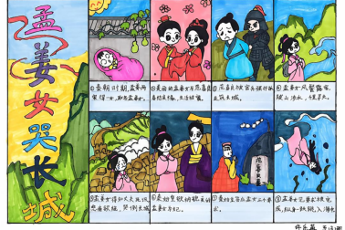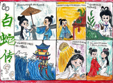 五年级美美乐乐们则以连环画形式再现《一幅壮锦》的瑰丽山河、《白蛇传》的断桥烟雨等场景。这些画面连贯、情节完整的作品,实为图像式思维导图,让学生在视觉叙事中建立整体结构意识,完成从理解到表达的思维跨越。