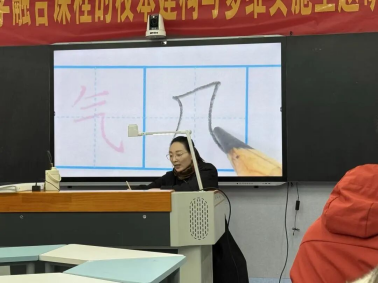 随后的专题讲解环节,刘老师围绕 “因字赋形” 这一核心观点,深入阐述了用笔与结构的辩证关系。她引用“用笔千古不易,结字因时相传”,强调关键在于对笔锋的精准掌控,而结构则是在用笔基础上对笔画的巧妙组合,需做到重心平稳、大小得宜、占格合理。通过对 “先紧后松”等书写规则的梳理,刘老师帮助教师们厘清了技法传授的脉络,使用笔与结构相互融合,助力教师更好地指导学生写好每一个汉字。
