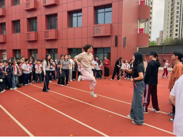 教职工比赛同样精彩纷呈。长绳在空中划出优美弧线,平日里谆谆教导的老师们化身为矫健的选手,在翻飞的长绳间身轻如燕、默契穿梭。场边,孩子们的加油呐喊声此起彼伏,赛场内外充满了欢声笑语。